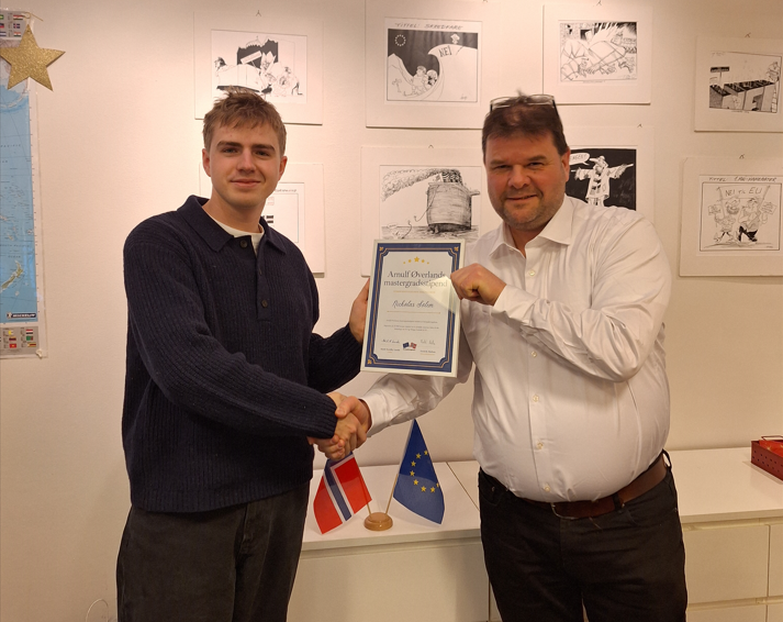– Nicholas skal i sin masteroppgave ta for seg et sentralt tema. Dette handler om fri bevegelse for menneskene i EU/EØS. Hvis vi ikke har gode nok systemer for å godkjenne utdanninger landene imellom, er dette egentlig en uakseptabel begrensning på prinsippet om fri bevegelse. Sentralstyret i Europabevegelsen var i år ikke i tvil om hvilken søknad som skulle motta Arnulf Øverlands mastergradsstipend og vi ønsker ham lykke til med arbeidet, sier Mellem.